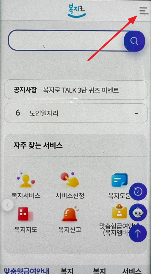 복지로 앱을 설치 후 실행하면 아래와 같은 화면이 나오게 되는데요. 우측 상단에 있는 줄 3개를 터치합니다.