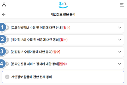개인정보 활용에 관한 내용을 확인하고 각각 동의를 하거나 전체동의를 누르고 다음 화면으로 넘어갑니다.