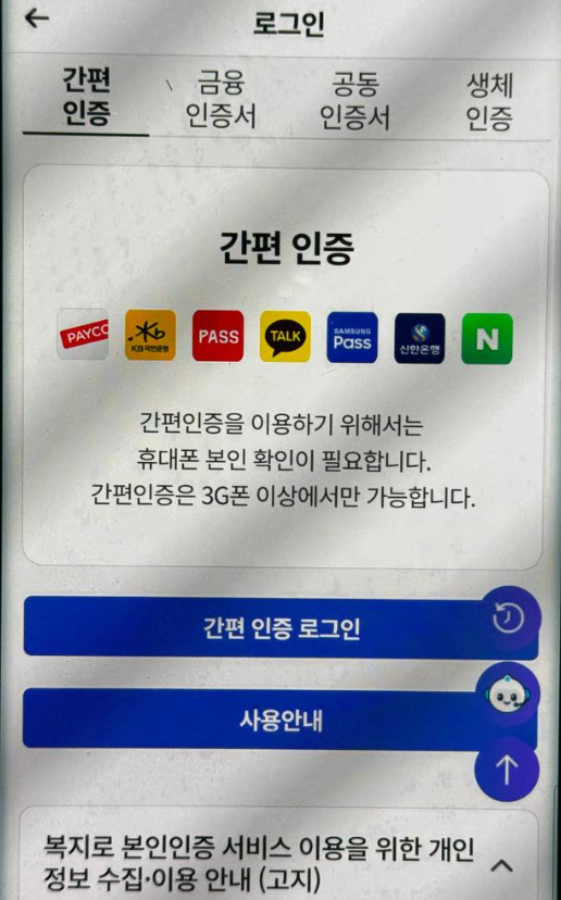 공동인증서 이외에 간편인증도 가능하므로 원하는 인증서를 선택해서 로그인을합니다.