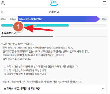 이제 다시 신청자의 스마트폰으로 돌아와서 "소득.재산 신고 등록단계"를 진행합니다.