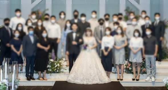 결혼식의 경우 식장에 참석하는 모든 사람은 의무적으로 마스크 착용해야 하나 신랑,신부에 한해서 마스크 착용 예외 인정, 기념사진 촬영시에는 신랑,신부,양가부모님까지만 마스크 예외 인정.
