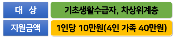 - 기초생활수급자 : 생계, 의료, 주거, 교육급여 수급자, 조건부 수급자, 보장시설 수급자