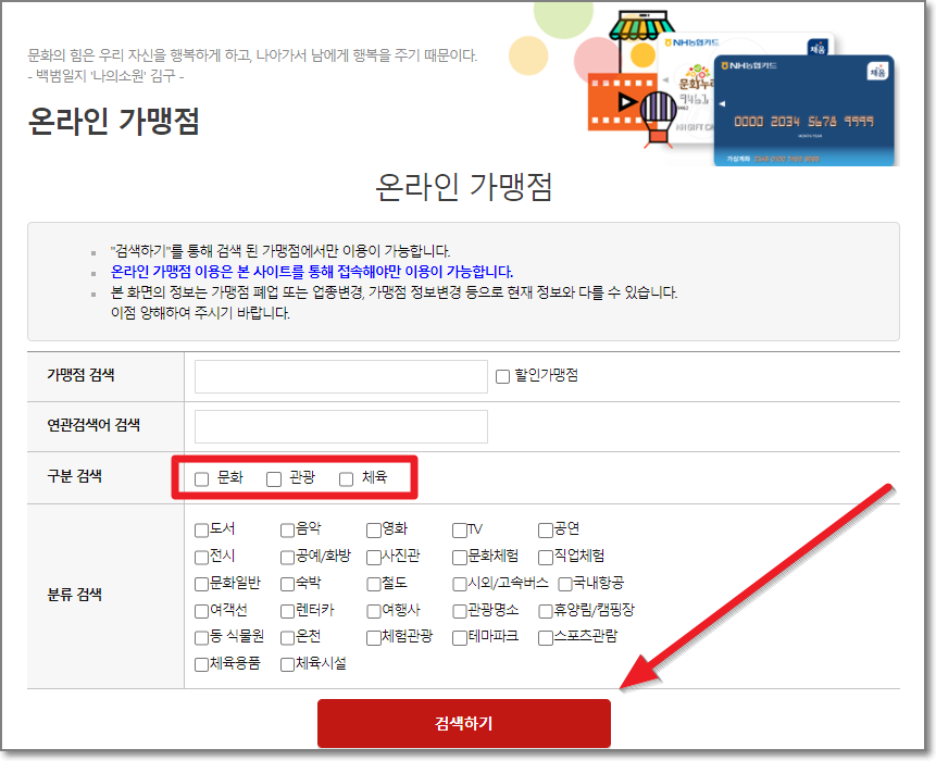 문화누리카드 오프라인 가맹점 찾기 바로가기를 눌러서 아래와 같은 창이 열리면 지역을 선택하고 구분의 3군데를 모두 체크하고 나서 검색하기를 누릅니다.