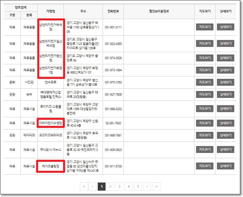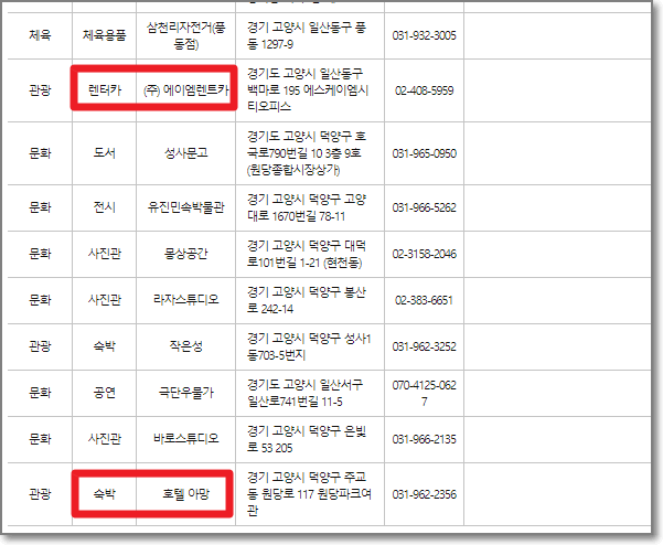 여기서는 경기도 고양시를 선택하고 구분을 "문화, 관광, 체육"을 모두 선택하고 검색을 했더니 아래처럼 나왔습니다.