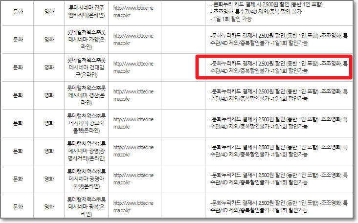 그리고 CGV와 롯데시네마와 같은 영화홈페이지에서 예매도 가능한데요. 아래처럼 내용을 보시면 문화누리카드로 결제시 2500원이 할인됩니다.