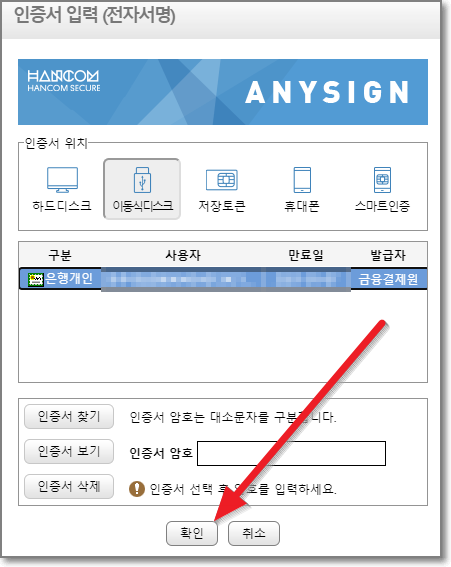 공인인증서 선택 후 인증서 암호를 입력하고 확인을 누릅니다.