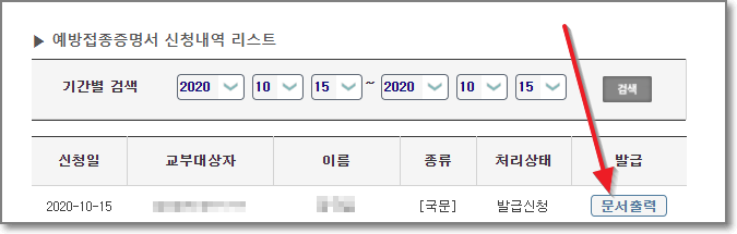 기간은 민원을 신청한 기간이지 예방접종내역의 기간이 아니니까 그대로 두시고 "문서출력"을 누릅니다.