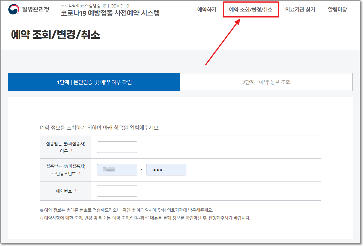 코로나19 예방접종 사전예약 시스템이 본인 인증을 하고 들어가서 위에 있는 "예약 조회/변경 취소"를 누르고 항목 입력 후 2차 예약변경을 하면 되는데요. 이 때 예약번호를 알아야 합니다.