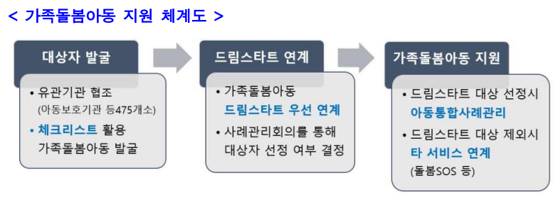 서울시가 발굴한 가족돌봄아동은 취약가정 아동에 맞춤 지원 프로그램을 제공하는 '드림스타트'와 연계하여 집중적인 사례관리와 맞춤형 통합서비스를 제공합니다. 기존에는 기초생활수급자‧차상위‧한부모가정 등 취약계층 아동만을 대상으로 하였던 '드림스타트'는 앞으로 중위소득 100% 이하 원가정 및 가정위탁가족돌봄아동까지 대상을 확대하여 가족돌봄아동에 대한 보호를 강화하게 됩니다.