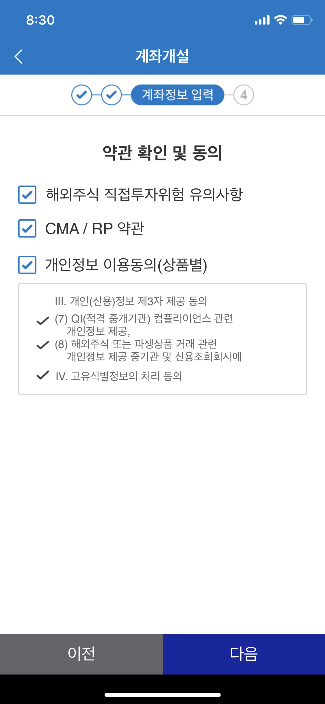 다음을 누르면 아래처럼 또 약관이 나오는데요. 읽어보시고 그리고 다 체크하고 다음으로 넘어갑니다.