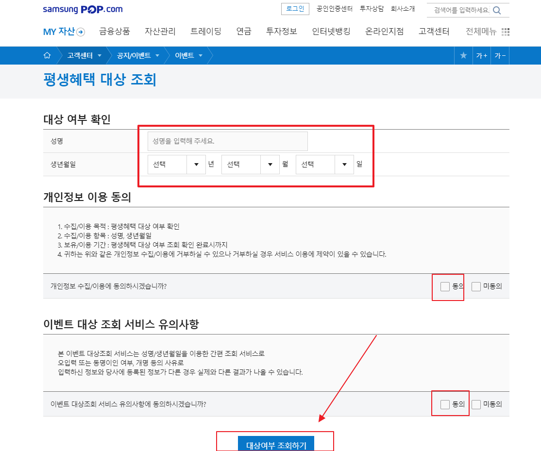 아래에 빨간네모안에 있는 곳에 성명과 생년월일 채우시고, 밑에 동의를 두개 누르신 다음에 "대상여부 조회하기"를 누릅니다.