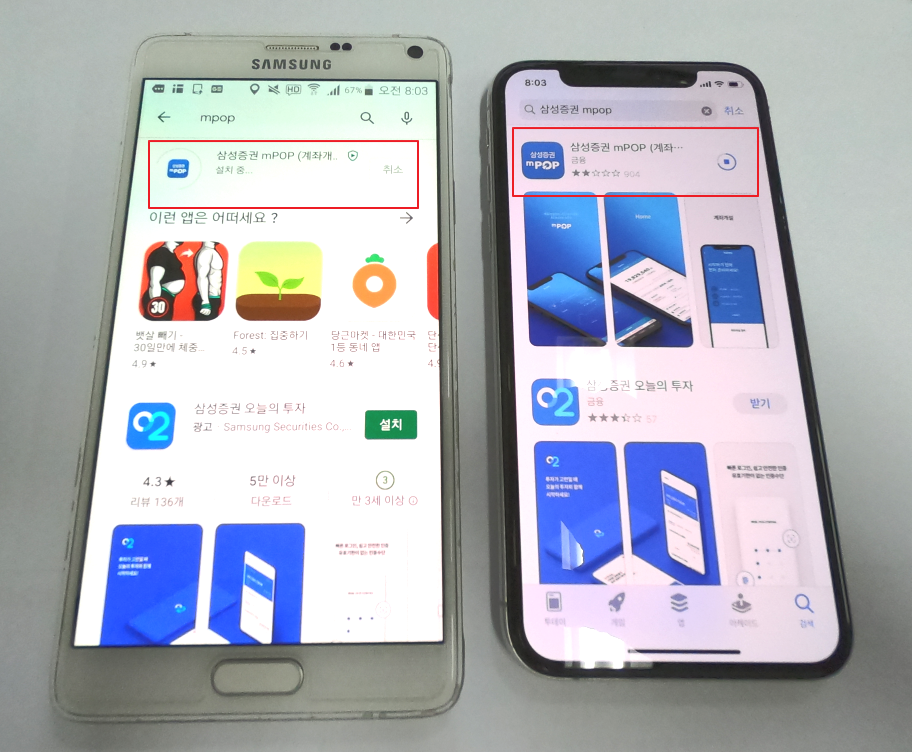 두 기종 모두 앱장터(구글 플레이스토어, 앱스토어)로 들어가서 mpop 를 검색하면 아래처럼 삼성증권 mPOP가 나오는데요. 이걸 설치하시면 됩니다.