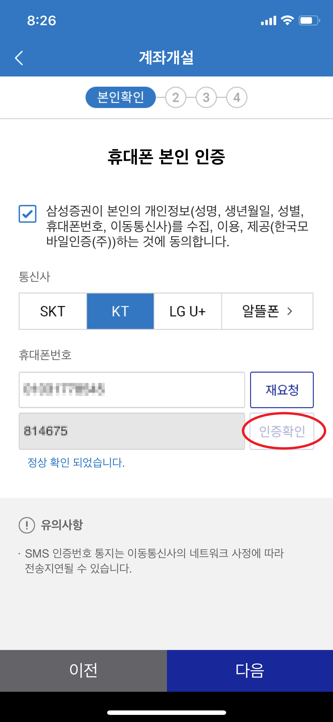 문자가 오면 숫자를 입력하고 인증확인 버튼을 클릭하고 다음을 클릭합니다.