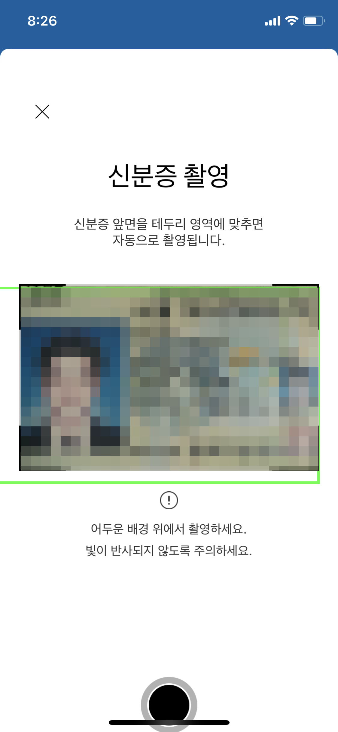 셔터버튼 누를필요도 없이 그냥 신분증에 네모박스 부분을 가져다 대면 찍힙니다.