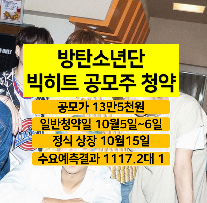 카카오게임즈를 통해서 공모주청약이 많이 알려진가운데 금년도 최고의 인기몰이가 예상되는 빅히트 엔터테인먼트가 28일 공모가 13만5천원으로 확정되면서 10월5일과 6일 양일간 일반청약에 나서게 됩니다.