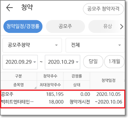 날짜를 10월29일까지로 보꾸고 조회를 해보면 10월5일부터 6일까지 하는 빅히트엔터테인먼트의 공모주 내용이 나옵니다. 청약주수는 185,195주이고 미래에셋에서는 이 계좌로 18000주까지는 신청할 수 있습니다.
