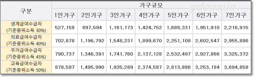 즉, 4인 가구일 경우에 소득인정액이 142만 원 이하여야 생계급여 수급이 가능하며, 189만 원 이하이면 의료급여가, 213만 원 이하이면 주거급여가, 237만 원 이하이면 교육급여 수급이 가능합니다.