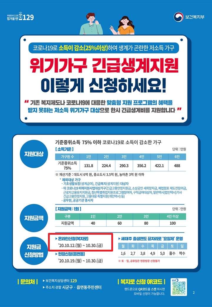 여기서 말하는 저소득 가구란 일반적으로 말하는 "기초수급자+차상위계층"이 아니고, 이번에 정부에서 따로 정의한 기준중위소득 75%이하 를 말합니다. 온라인 신청은 10월12일(월)부터 10월30일(금)까지입니다.