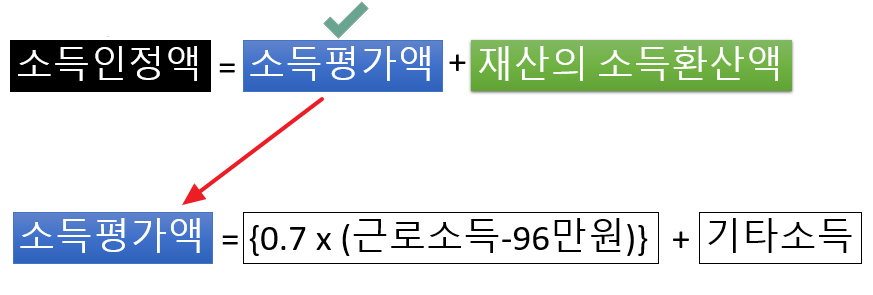 소득평가액은 근로소득(세전)에서 기본공제액인 96만원을 뺀 금액에서 30%를 추가로 공제한 70%의 금액에 사업소득이나 이자소득과 공적이전소득 그리고 무료임차소득 등의 기타소득을 합한 금액입니다.
