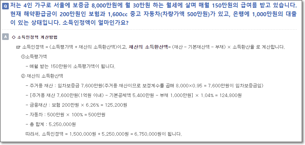 모의 계산기를 사용하여 아래의 예시가 실제로 소득인정액 675만원이 나오는지 보겠습니다.