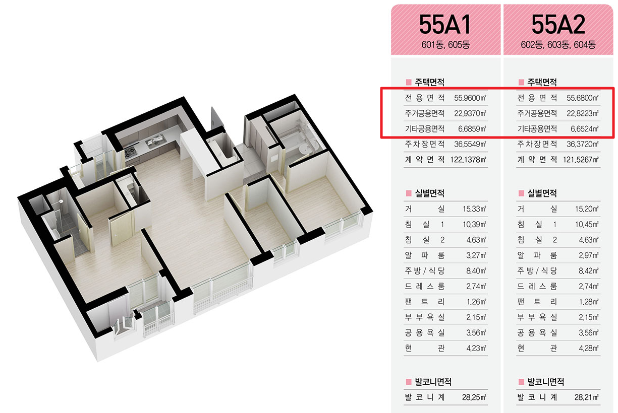 제곱미터를 평으로 환산하는 산식은 제곱미터 X 0.3025 이므로 46제곱미터는 약 13.9평이며, 55제곱미터는 16.6평인데 이는 전용면적으로 이미 공급되고 있는 화성 봉담2 A-2블록 신혼희망타운을 보면 평수의 기준이 되는 "공급면적"이 85제곱미터정도 나오는것을 알수 있습니다. 따라서 55제곱미터가 약 25평정도 되는 것입니다. 발코니면적은 원래부터 서비스면적이기때문에 공급면적에 포함되지 않습니다.