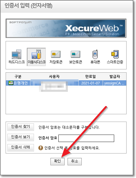 공인인증서 입력창이 나오면 암호 입력후 "확인"을 누릅니다.