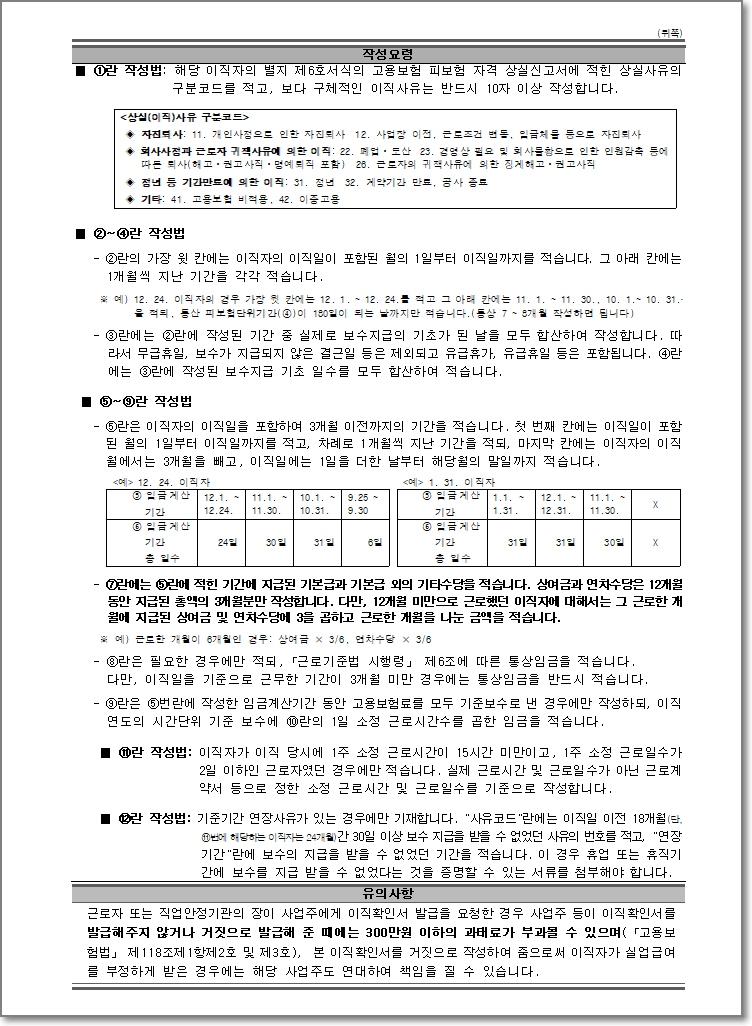 피보험자 이직확인서(일용근로자용) (이직사유에 자발적 사유는 불가합니다.)