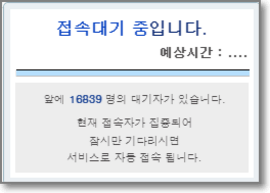 그러면 이런 놀라운 화면이 뜨게됩니다. 거의 뭐 온라인게임 대인기 있을 때 서버에 접속하려고 기다리던 생각이 갑자기 납니다. 16839명이 기다리고 있기 때문에 예상시간도 모릅니다.