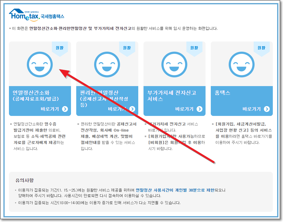 우선 국세청 홈택스로 접속을 합니다. 아마도 연말정산 시즌이면 아래처럼 뜰텐데요. 이용시간은 30분입니다. 하지만 충분합니다. 화살표친 "연말정산간소화"를 누릅니다.