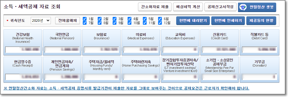 그럼 아래처럼 각 항목별로 해당하는 금액이 조회가 됩니다. 전산망이 너무 많이 좋아져서 이제는 대부분의 자료가 자동으로 끌어와집니다. 상당히 편리하게 변했습니다.