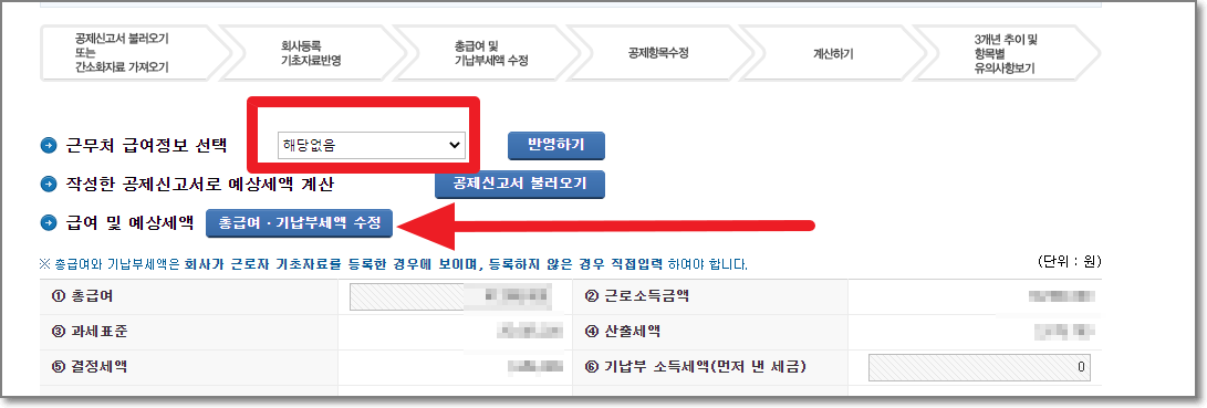 저 접속화면을 지나면 아래처럼 나오는데요. 근무처 급여정보 선택이 "해당없음"으로 나오는 경우가 있습니다. 이럴때는 오른쪽에 있는 "반영하기"를 누르거나 해당없음을 선택해도 자신의 회사가 안나옵니다. 포기하지 마시고 아래에 있는 "총급여.기납부세액 수정"을 눌러서 연봉 총액을 입력합니다. 예를 들어 세전 연봉이 3900만원이면 그대로 입력하시고 7800만원이라면 그대로 입력하시고 다시 돌아오시면 됩니다.