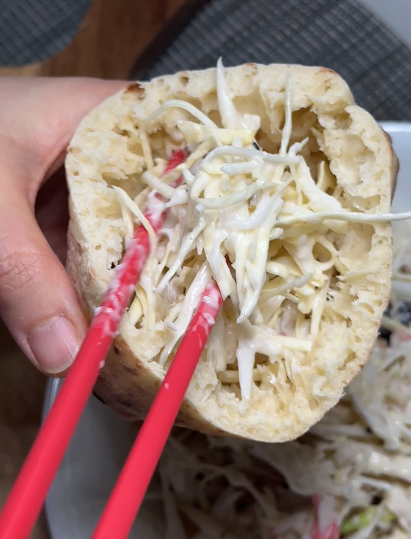 두 번째 샌드위치는 샐러리, 계란, 양파에 마요네즈를 더해 만든 속을 채운 버전이에요. 신선한 샐러리의 아삭함과 고소한 계란의 부드러움, 그리고 양파가 어우러져 깔끔하고 상큼한 맛이 느껴졌습니다. 마요네즈가 전체 재료들을 잘 결합해주어 촉촉하면서도 조화로운 맛이 인상적이었어요.