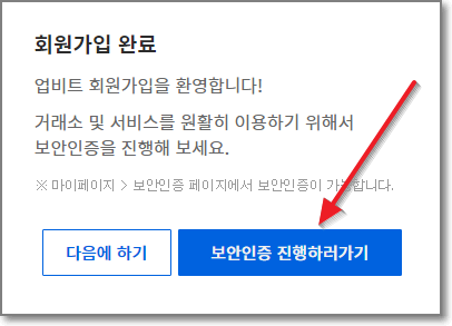 닉네임을 적고 설정을 누르면 "회원가입 완료"되었다는 창이 나오는데요. 여기서 보안인증을 진행해야만 거래를 진행할 수 있습니다. "보안인증 진행하러가기"를 누릅니다.