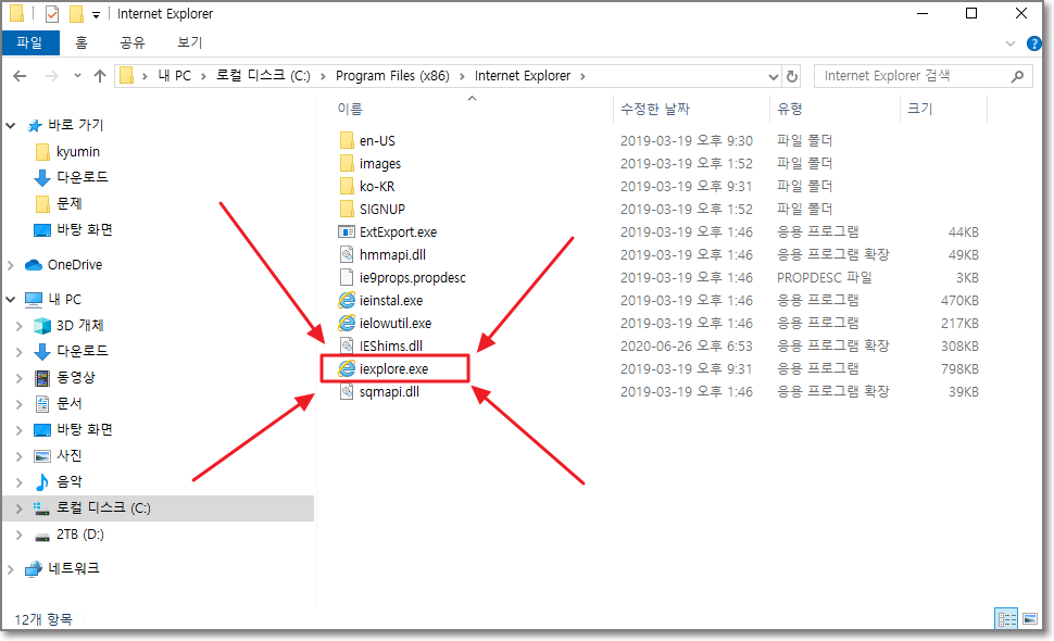 이제 드디어 나왔습니다. iexplore.exe 이것이 바로 익스플로러 32비트 입니다. 더블클릭 하면 실행이 됩니다. 이제 자동차민원 대국민포털을 원활하게 이용하실 수 있습니다.