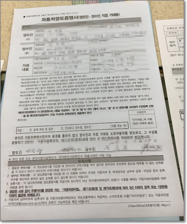 그리고 개인이긴 한데 한사람은 필요한 서류를 챙겨서 돈받고 서류와 차를 챙겨가서 등록해야 하는 경우가 있습니다.