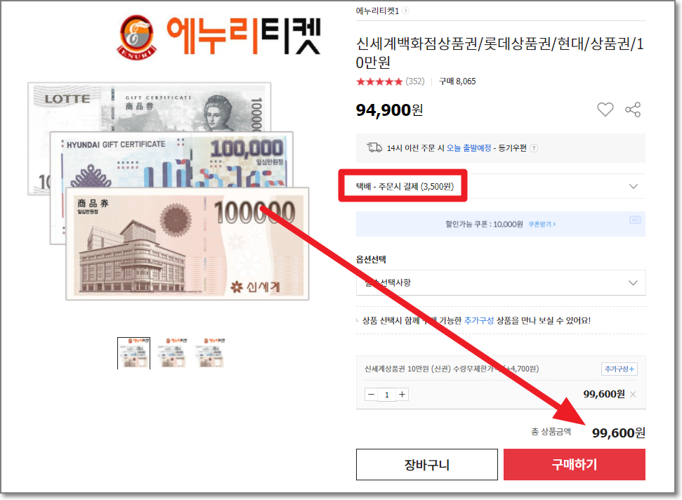 또한 옥션등지에서 상품권을 사게 되면 10만원짜리를 99600원에 살 수 있지만 이 역시도 택배비가 3500원 추가 되기 때문에 그랜저 세금 내려고 90만원어치를 사도 1000원 이득(?)을 보게 됩니다.