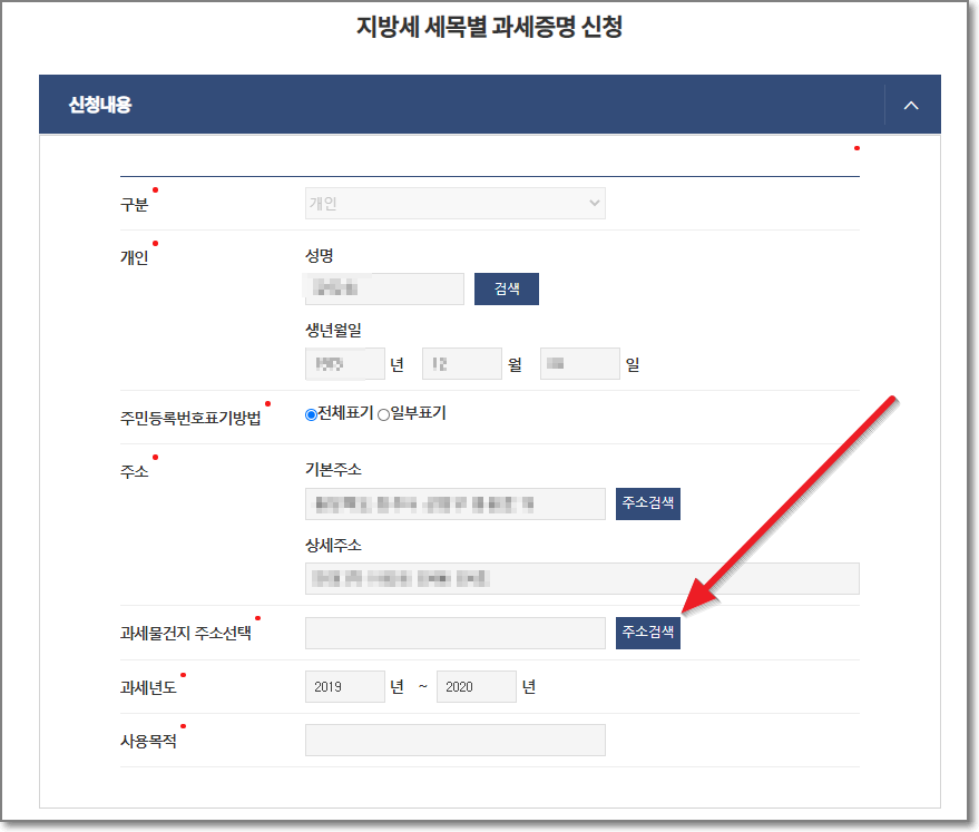 지방세 과세증명 신청 내용에서 대부분은 자동으로 채워있습니다만, 과세물건지 주소선택은 "주소검색"을 눌러서 채워줍니다. 상동 이런게 있으면 좋겠습니다. "사용목적"은 "자동차매매"라고 쓰시면 됩니다.