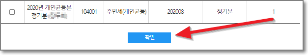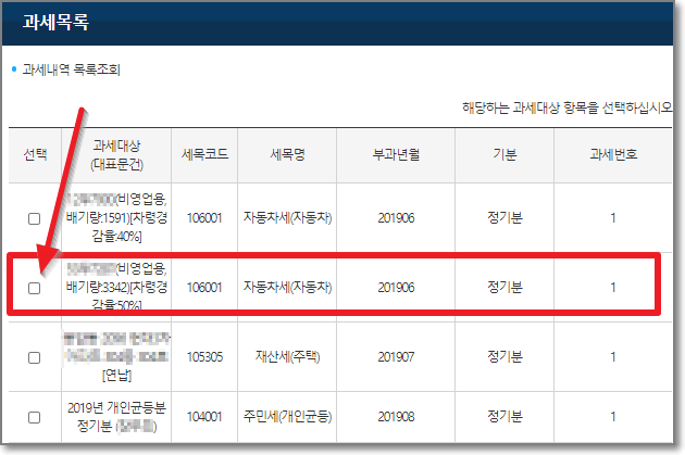 민원신청하기를 누르면 이제 과세목록이 나오게 됩니다. 차량뿐 아니라 집이나 주민세도 과세한 내용이 있습니다만 여기서는 자동차세 완납증명서가 필요하므로 판매하고자 하는 자동차를 선택하여 체크합니다.