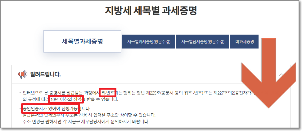 위변조하면 10년이하의 징역이라는 점 확인하시고요. 공인인증서가 반드시 있어야 한다는 점 확인해주시고, 스크롤을 내립니다.