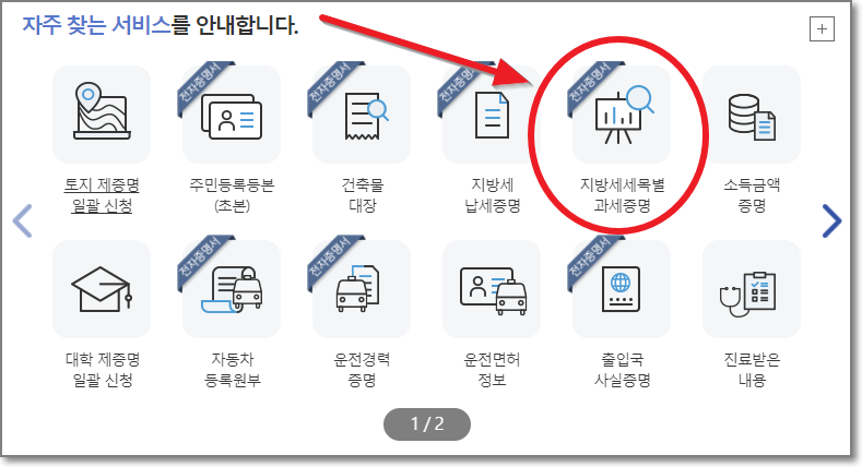 로그인 후 아래처럼 "지방세 세목별 과세증명"을 클릭합니다.