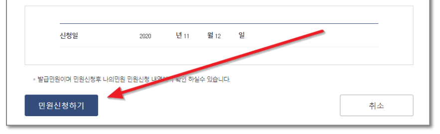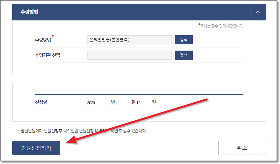 스크롤을 죽 내려서 수령방법 한번 확인하시고, "민원신청하기"를 누릅니다.