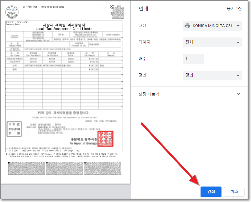 미리보기로 문서를 한번 쫙 봐주시고요. "인쇄"를 누릅니다.
