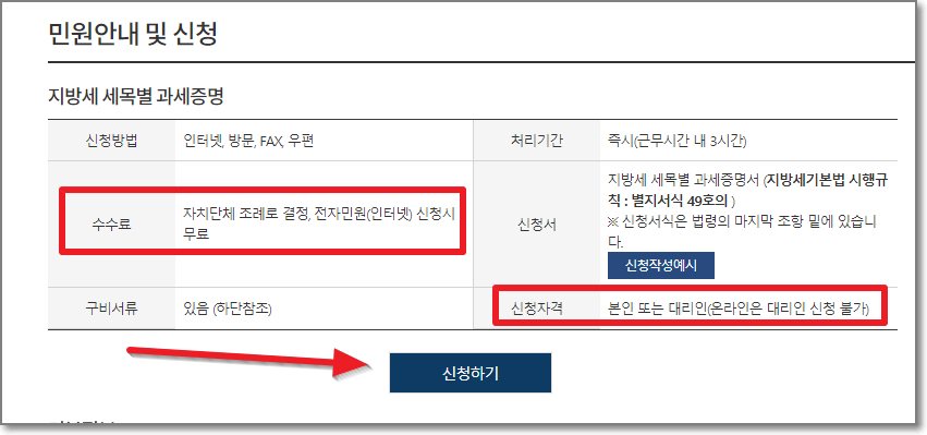 민원안내 및 신청이 나오는데요. 수수료는 위에서 말씀드린바와 같이 인터넷 신청시 무료입니다.