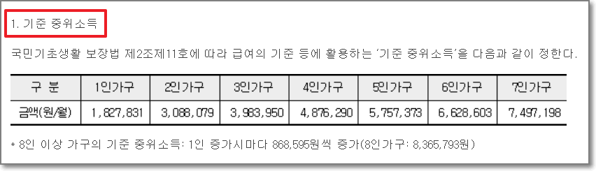 그리고 아래처럼 "기준 중위소득"을 알아야 합니다. 중위소득에 대해서 좀 더 자세히 알아보시려면 [중위소득이란 무엇인가]를 읽어보시면 좋습니다.