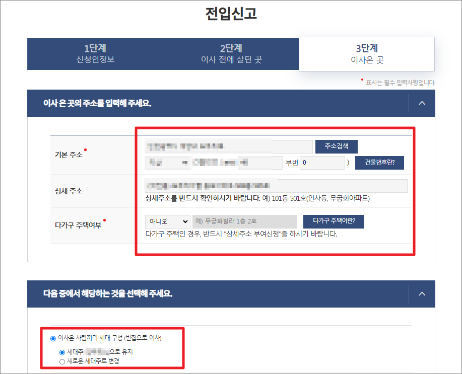 이사 온 곳의 주소를 입력하고 다가구 여부를 선택 후 이사온 사람끼리 세대 구성(빈집으로 이사)을 선택합니다.