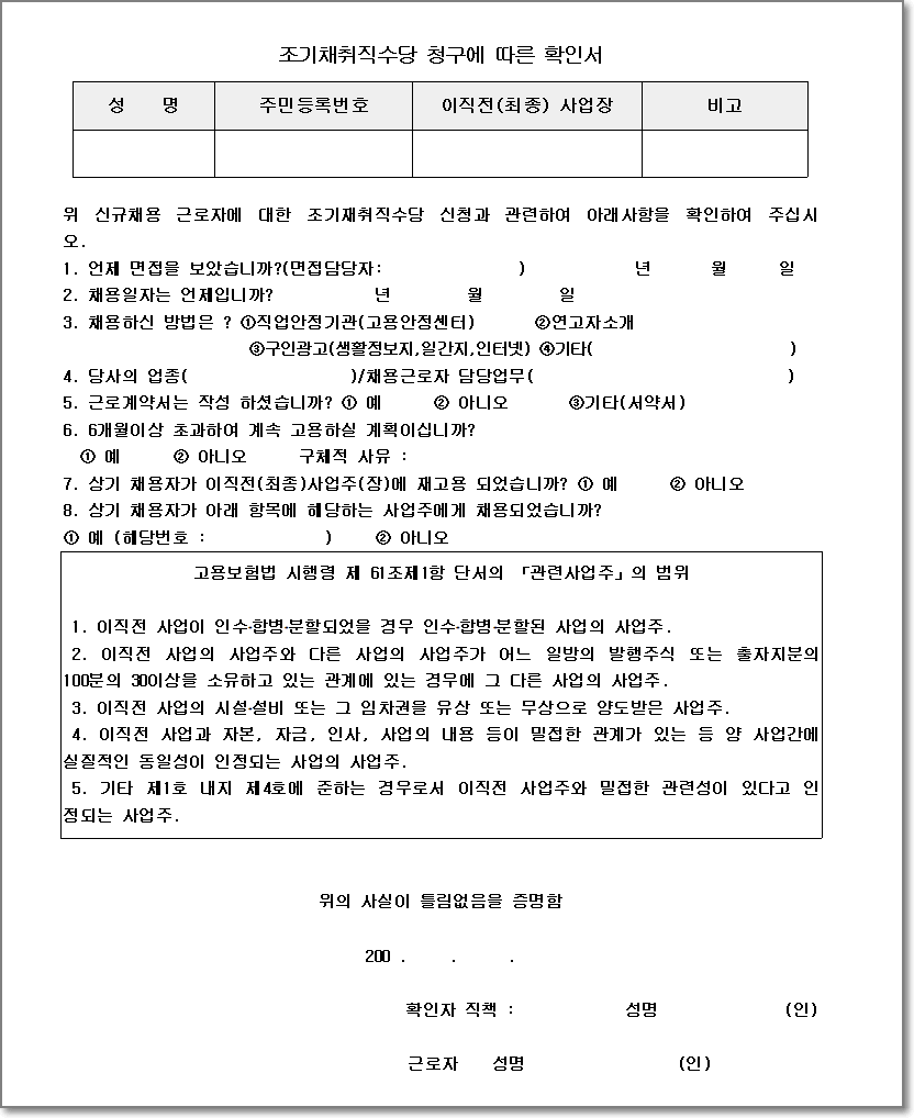 조기재취업수당 청구시 위에 있는 "조기재취업수당청구서"외에 근로계약서 또는 연봉계약서 사본, 조기재취업수당에 따른 확인서를 함께 제출해야 합니다.