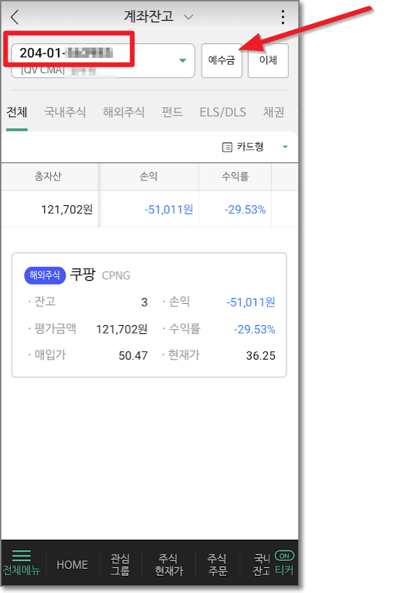 계좌잔고에도 계좌번호가 나오지만 여기서는 "예수금"을 눌러보겠습니다. 예수금 밑에도 "계좌번호 204-01-xxxxx"라고 나오니까 이를 종이에 적어놓고 돈을 보내기로 합니다.(해외주식으로 쿠팡을 샀는데 현재 손실이 -29.53%이군요) 여기서 잠시 "예수금"에 대해서 말씀드리면, 주식은 팔자마자 현금으로 융통할 수가 없는데요. 주식을 판지 이틀(2 영업일)이 지나야 다른 계좌 등으로 이체가 됩니다. 이를 기억하셔야 급하게 현금을 융통해야 할 때 준비할 수가 있겠지요? 계좌번호를 잘 적어놓았으면 이제 카카오 뱅크나 원하는 뱅킹 앱을 실행합니다.(계좌이체를 해야 하니까요)