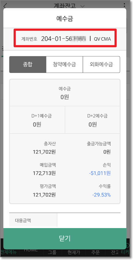 다시 나무 앱으로 돌아와서 "예수금"을 눌러서 10만 원이 들어와 있음을 확인하고 "닫기"를 누릅니다.