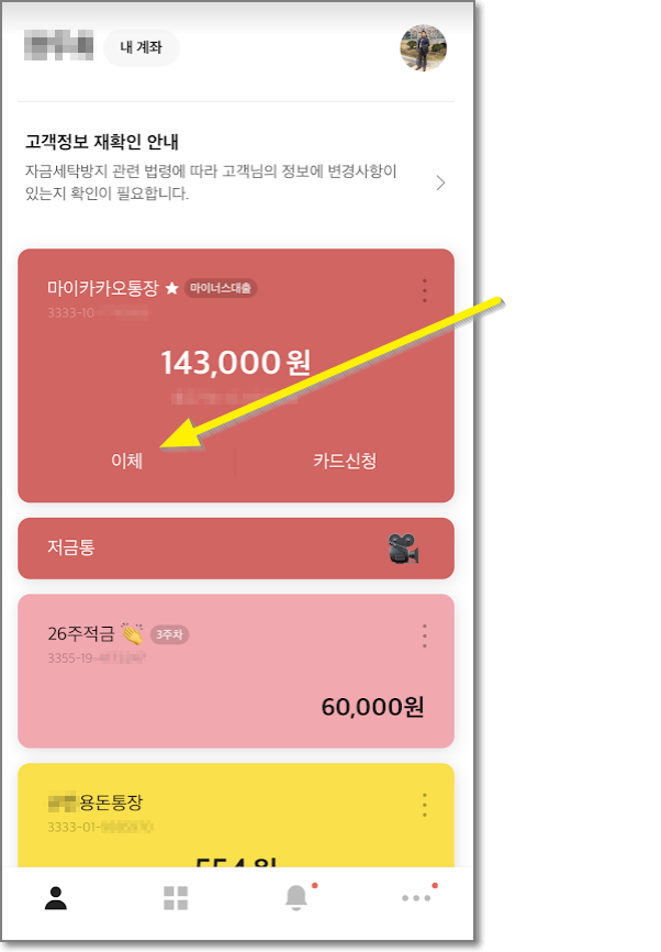 여기서는 "카카오 뱅크"를 이용해서 나무 앱 주식계좌로 이체를 해보겠습니다. 카카오 뱅크를 실행하고 "이체"를 누릅니다. 이체란에 계좌번호를 적으며 되는데요. 아까 위에서 적어놓은 계좌번호를 적습니다.
