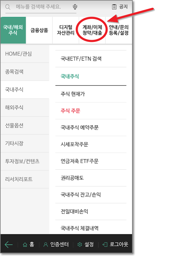 로그인을 했으면 화면의 왼쪽 아래에 보면 줄 세 개(전체 메뉴)가 있습니다. 캡처 화면에서는 환영 메시지가 가리고 있는데요. 금방 사라집니다. 뒤에 있는 줄 세 개를 누르고 전체 메뉴가 나오면 오른쪽 화면에서 처럼 "국내 주식"을 누릅니다.